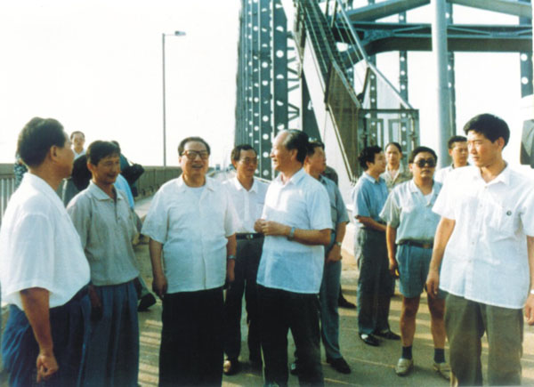 1990年4月16日,中央紀委書記喬石到九江長江大橋視察。